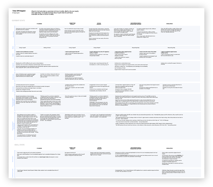 I led both qualitative and quantitative research efforts with employees and stakeholders internationally to understand how people experienced key moments in their employee journey, including onboarding, device setup, payroll inquiries, and time-off requests. By synthesizing these findings into clear insights and design directions, the team identified opportunities to streamline workflows, reduce cognitive load, and create a more consistent, scalable employee experience.