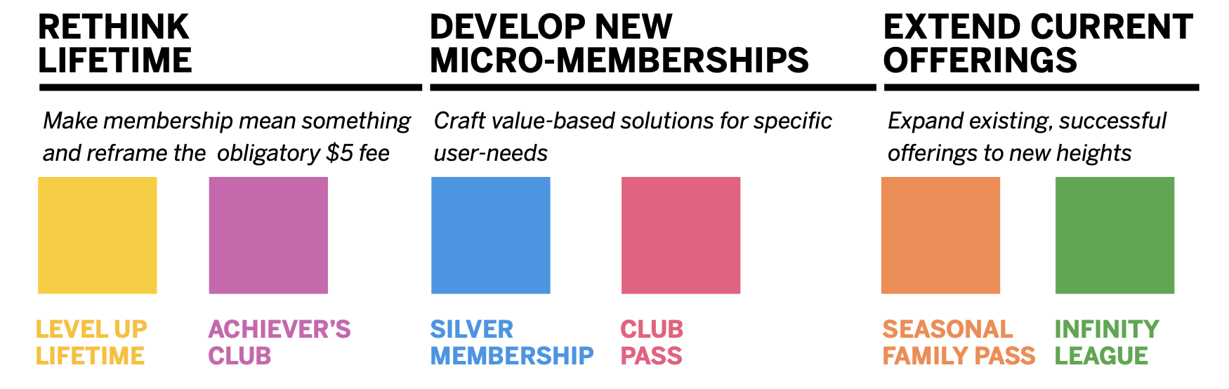 Pulling from our previous work, I led the Options for New Paradigms phase by driving a focused 4-week sprint to generate, prioritize, and align on innovative membership concepts that balanced player value, business objectives, and implementation feasibility.